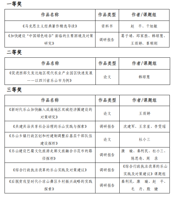 近日,乐山市人民政府印发《关于第二十次哲学社会科学优秀成果获奖项目的通报》,乐山市委党校喜获丰收,共9项成果获市政府奖,其中获市政府一等奖2项、二等奖1项、三等奖6项。